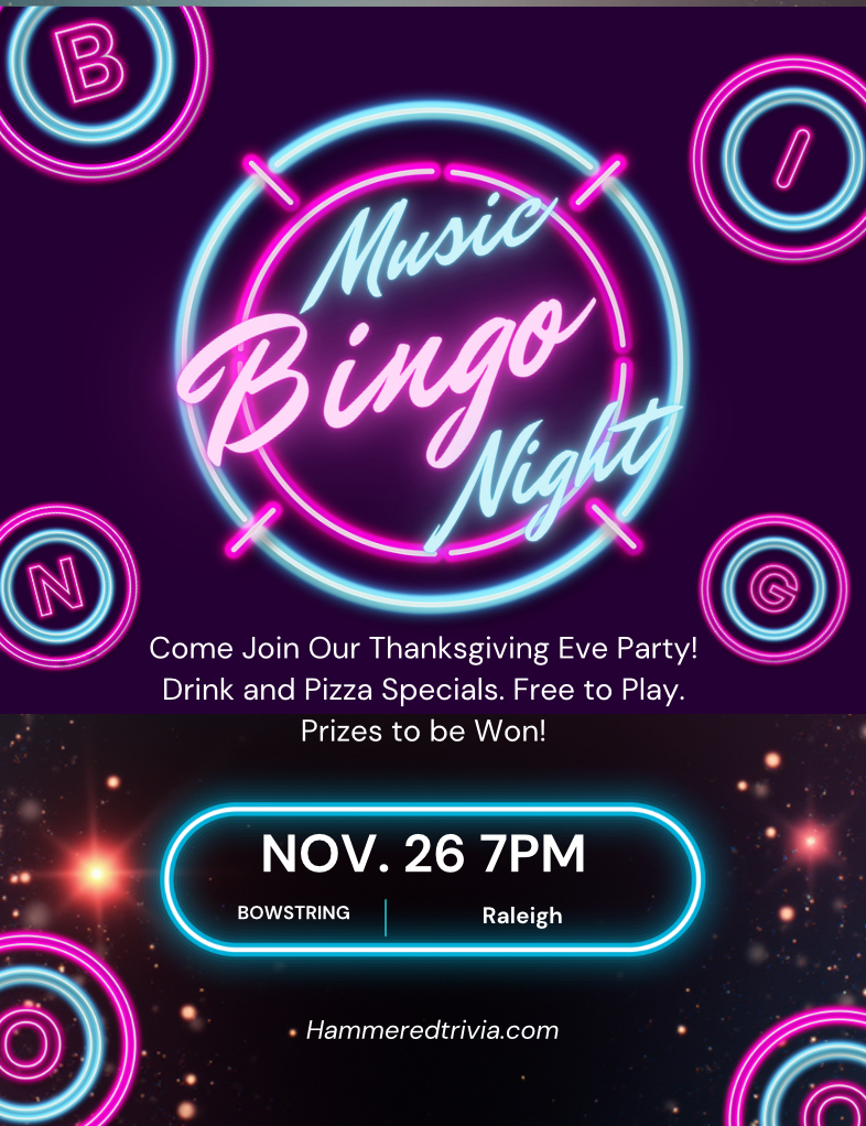 Thanksgiving Eve party with Music Bingo! Free to play, prizes to be won! Bring your friends and family for a rocking Thanksgiving Eve.