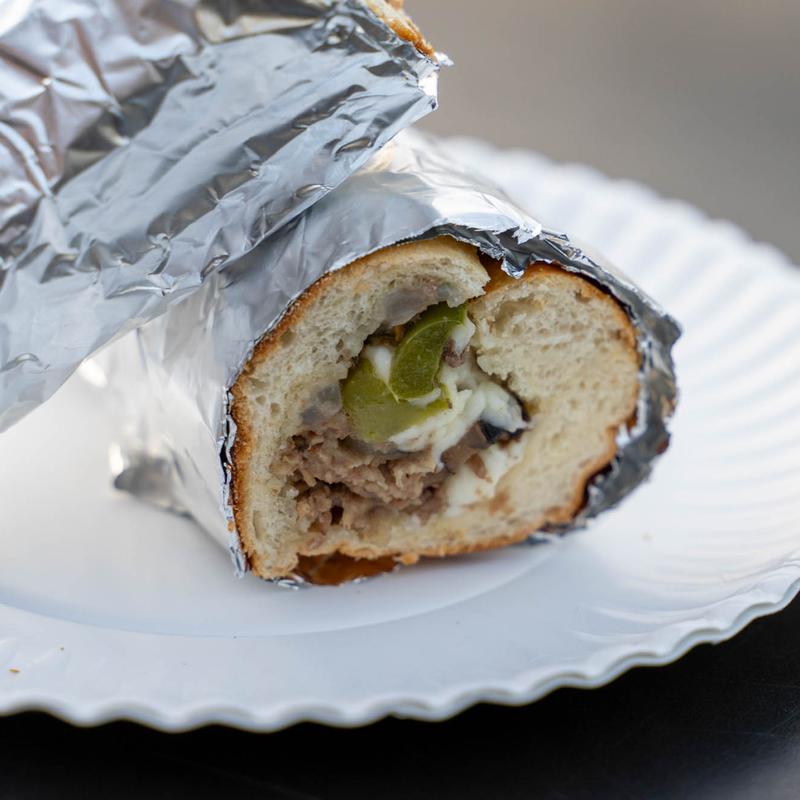 Sliced Beef, Green Peppers, Garlic, Sauteed Onions & Mushrooms, Mozzarella Cheese, 10″ White Bread Hoagie