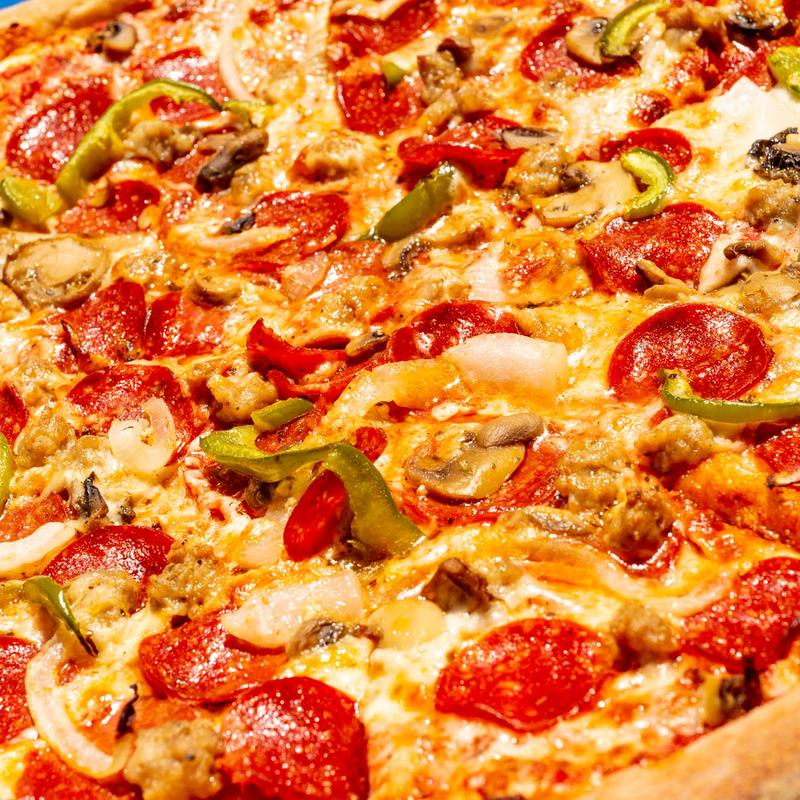 Authentic scratch made pizza • Toppings: Pepperoni, Sausage, Ham, Ground Beef, Sauteed Mushrooms, Sauteed Onions, Green Peppers, Black Olives, Jalapenos, Bacon, Pineapple, Chicken, Tomato, Basil